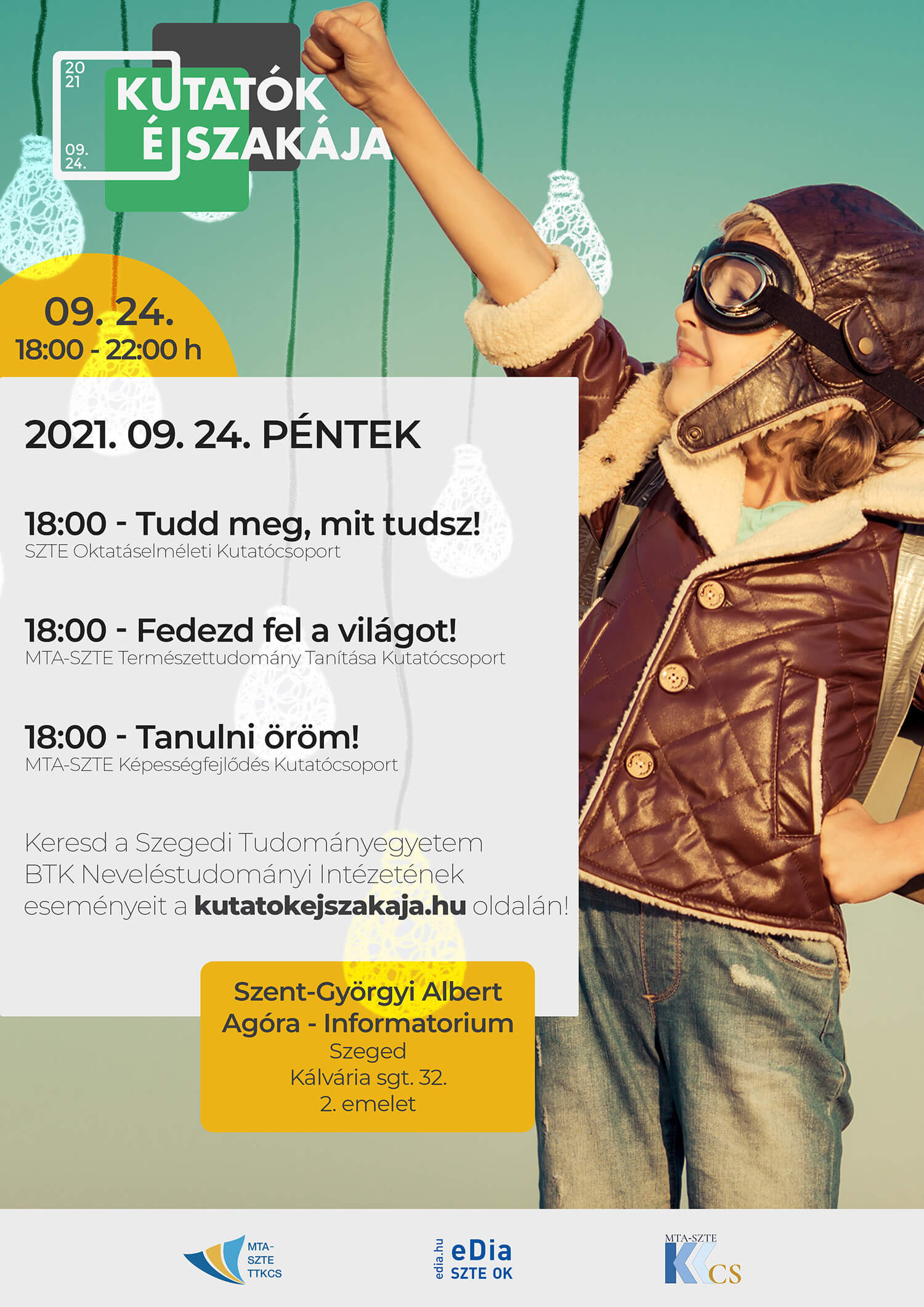 Ebben az évben is szeretettel várjuk iskolájuk tanulóit a „Tudd meg, mit tudsz!”, a „Fedezd fel a világot!” és a „Tanulni öröm!” témák köré épített esti programjainkra, melyet Szegeden, a Szent-Györgyi Albert Agóra Informatóriumában 2021. szeptember 24-én 18:00 és 22:00 óra között tartunk!
